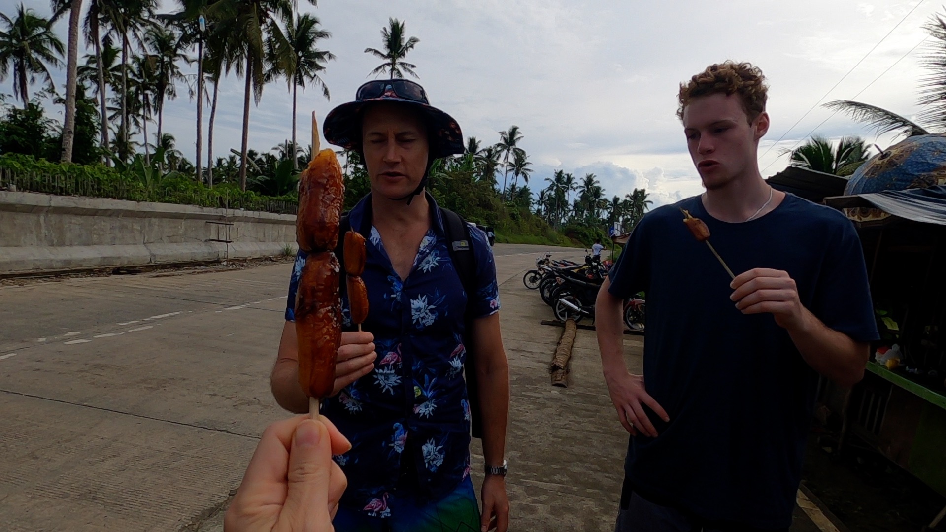 We drove our scooters out to the coconut plantation at the Maasin River nice and early to avoid the heat and the crowds. We met up with everyone at the place where the rope swing used to be, it had been replaced with a rickety high board construction that looked like it was safer to jump off than to stay standing on. When we arrived we found vendors selling the famous banana cue that Christine had been searching for, these were delicious fried bananas on skewers dipped in either a molasses or coconut type topping. We decided to work up an appetite with some Maasin River jumping before our banana cue. This is also the point where I lost my sunglasses, if you are watching the video you can see them sitting on top of my hat when I went in for the first jump, they are now forever in the Philippines. We jumped until we were all jumped out and then headed for the street vendors to fill up on banana cue and coconut water.