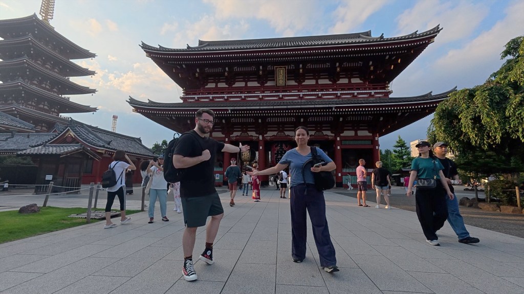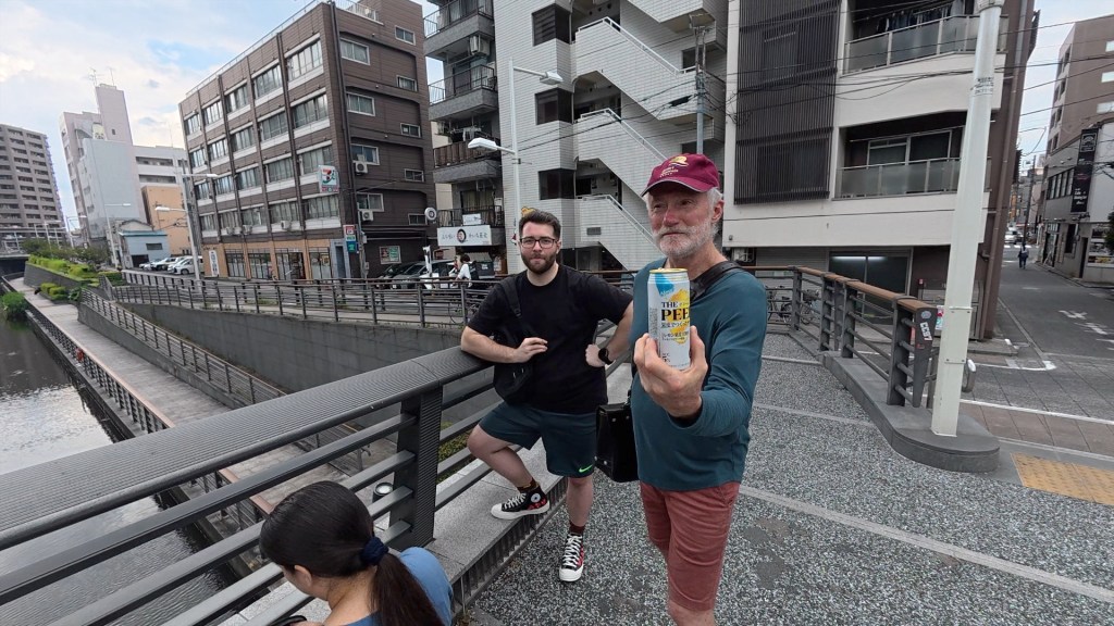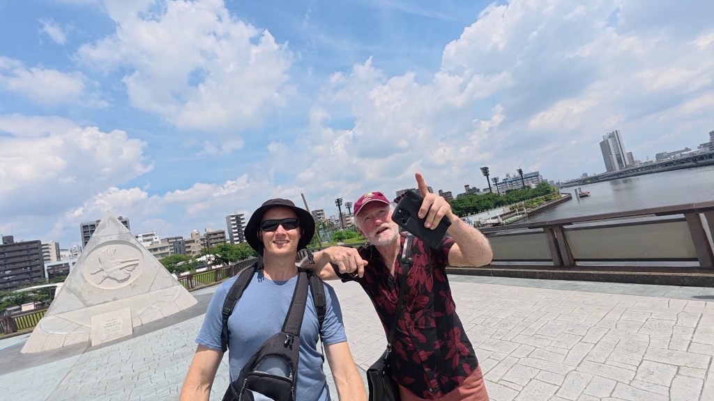 We walked along the river and then crossed a bridge that had two pyramid type structures on it. We came to an old shrine that was locked up and not accessible to the public, it was being maintained, but not well. Cassian said it a few times and continued to say it throughout our time in Japan, when he had been hear 10 years previously the place was absolutely pumping with standing room only. In comparison Tokyo is now extremely sparse on the ground. When we were catching the trains into the city a number of trains went past that were extremely packed but otherwise there was plenty of space on and around the streets even close to the heart of the city. Some theories were that a lot of tourists are not coming to Tokyo after the harsh 3 year lock downs that occurred around covid times, another is that people have left Tokyo for other places, or the declining population in Japan is finally catching up with them. A friend of Cassian’s who is currently teaching in Japan said that Tokyo is the only growing city in Japan and that many of the smaller outlaying cities have even less people in them. Possibly many elderly people are moving to Tokyo to be closer to various services.