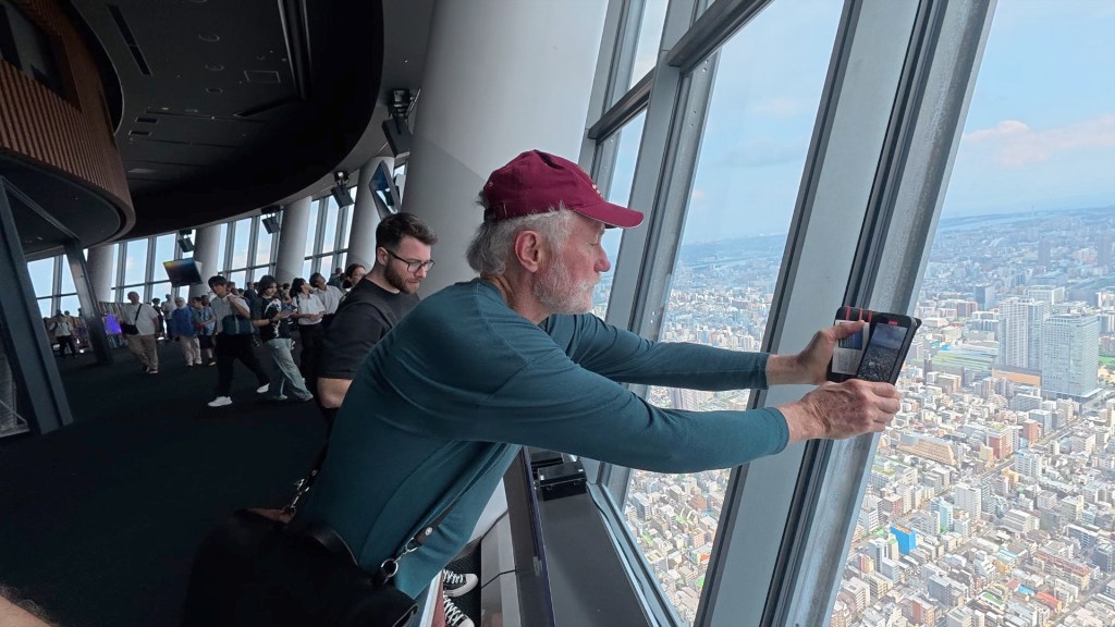 At around 2pm we made our way to the Skytree observation deck for the actual Skytree viewing, Christine had booked it for Cassian, Scotty and myself, she was not keen on the height and had opted out. We caught the express elevator that travels at 600m per min which works out at about 36km per hour. Apart from your ears popping and the speed on the screen, which I didn’t film as I wasn’t expecting it, there was no way to tell you were moving at any significant speed. From the viewing platform you had an un-restricted 360 degree view out over the city. I tried to capture some of it using the action camera. We wandered around the viewing platform and stood on the glass floor part. We took a stack of video and photographs and then made our way back down to Christine.